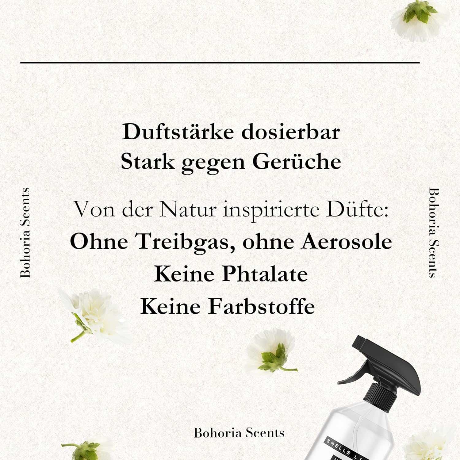 INHALT – 1x 500ml Original BOHORIA Premium Raumspray in hochwertiger Flasche. In den Varianten PURE LINEN, MYSTERIOUSLY MUSK, SILK STORIES, FIG TREE, LE JARDIN D'EDEN, SPICE SOUK hast du eine große Auswahl an unterschiedlichsten Duftnoten. Wer Wert auf hochwertige Düfte legt, wird die BOHORIA Raumdüfte lieben.